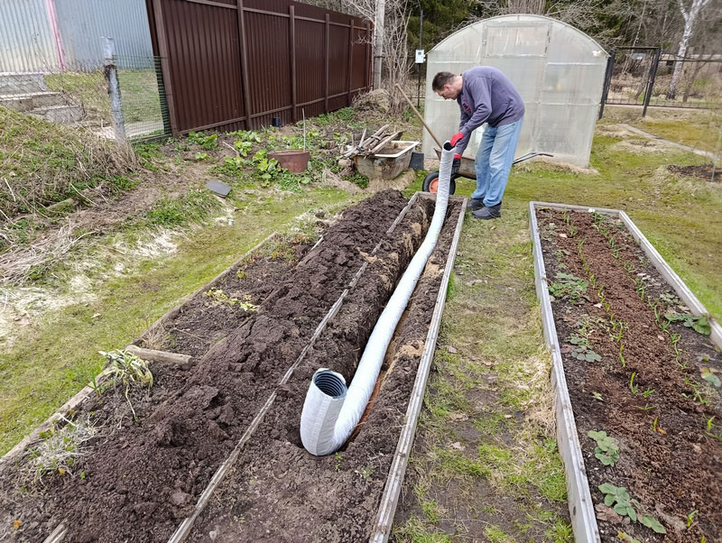 В земле дренажная труба с перфорацией, к ней подсоединяется труба без перфорации в виде полукольца. Под трубой укладывается медная сетка или проволока, которая подключается к электрогрядке № 6.